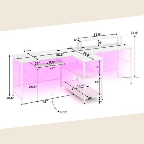 2-Person Reversible Computer Desk Long Office Desk with LED Lights-White