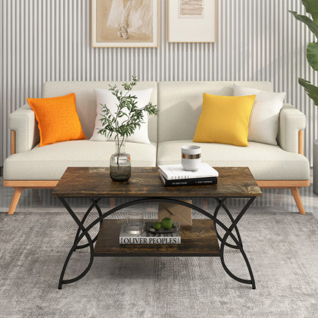 2-Tier Faux Marble Coffee Table with Marble Top and Metal Frame-Rustic Brown