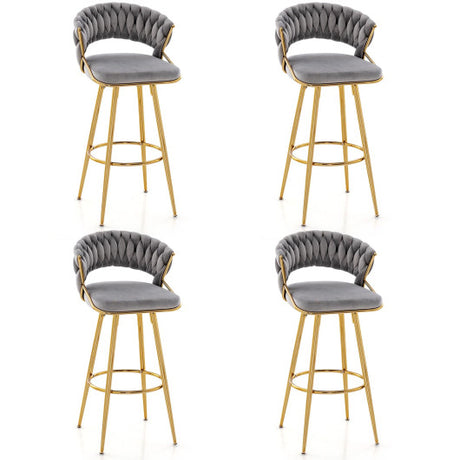 29 Inch Velvet Bar Stool Set of 2 with Woven Backrest and Gold Metal Legs-Gray