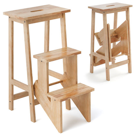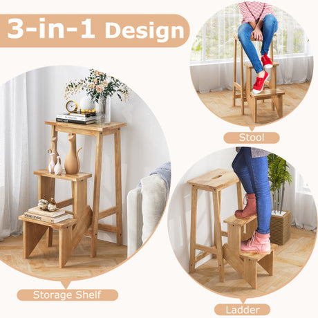 3-in-1 Rubber Wood 3 Tier Folding Step Stool Ladder Storage Shelf-Natural