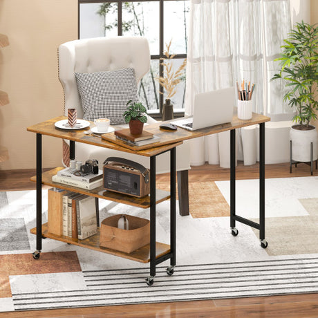 360° Rotating Sofa Side Table with Storage Shelves and Wheels-Rustic Brown