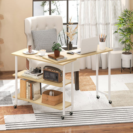 360° Rotating Sofa Side Table with Storage Shelves and Wheels-Natural