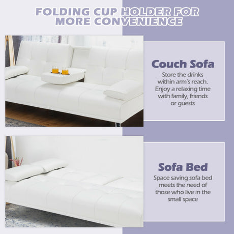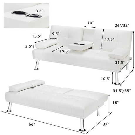 Convertible Folding Leather Futon Sofa with Cup Holders and Armrests-White