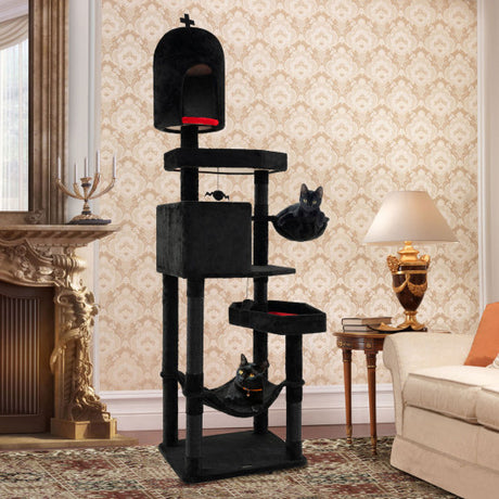 Gothic Cat Tree with 2 Cat Condos and Coffin Bed for Indoor Cats-Black