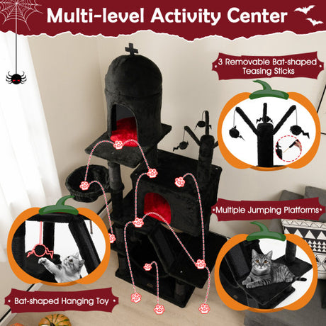 Gothic Cat Tree 49 Inch Tall Cat Tower 6-Tier Cat Activity Center with Coffin Bed-Black