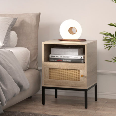 Home Boho Style Accent Table with Open Shelf and 1 Door Cabinet-Natural