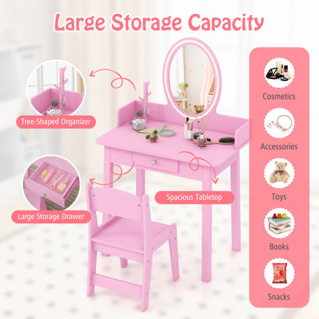 Kids Vanity Princess Makeup Dressing Table Stool Set with Mirror and Drawer-Pink