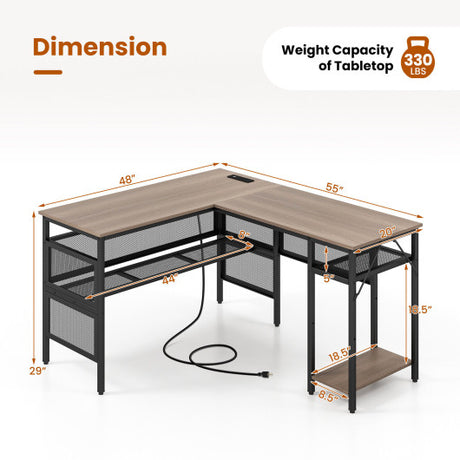 L-Shaped Computer Desk with Charging Station and Adjustable Shelf-Gray