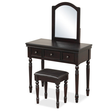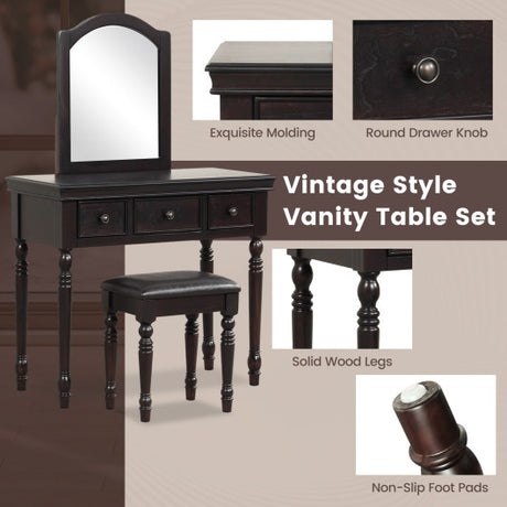 Makeup Vanity Table and Stool Set with Detachable Mirror and 3 Drawers Storage-Walnut