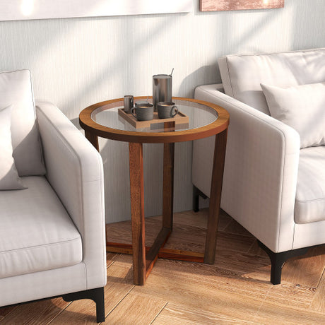 Modern Round End Table Sofa Side Table with Transparent Tempered Glass Top-Brown