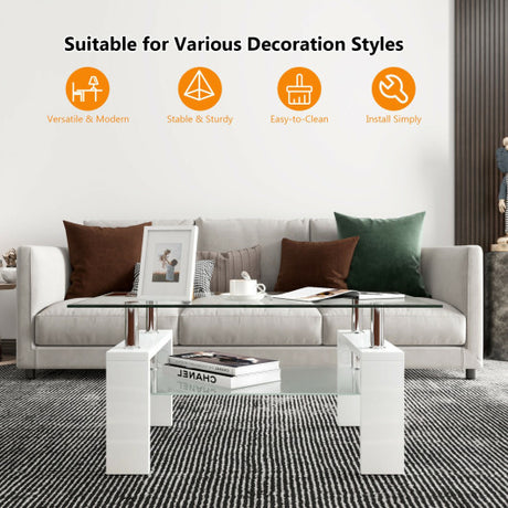 Rectangular Tempered Glass Coffee Table End Side Table with Shelf-White