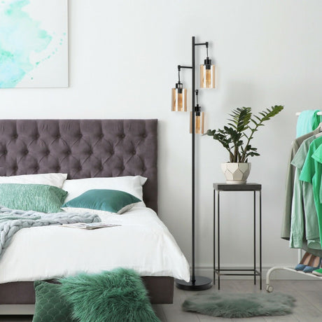 Retro Floor Lamp with 3-Head Hanging Amber Glass Shade
