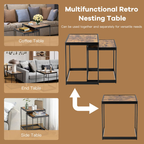 Set of 2 Modern Nesting End Tables with Metal Legs for Living Room-Rustic Brown