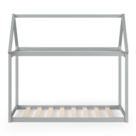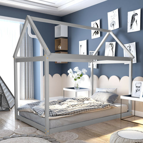 Stable Kids Platform Floor Bed with Roof and Heavy-Duty Slats-Gray