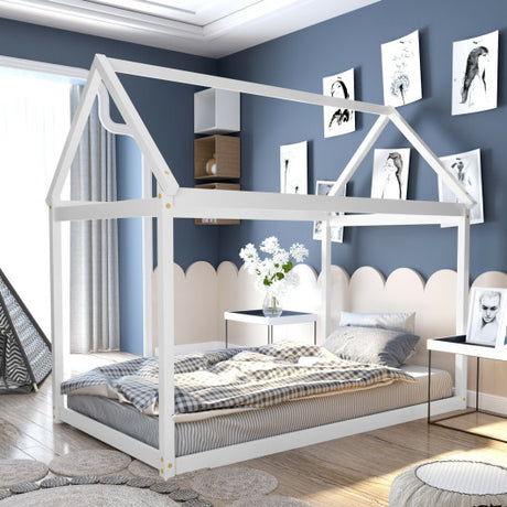 Stable Kids Platform Floor Bed with Roof ang Heavy-Duty Slats-White