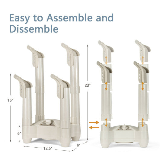 ● Quick Installation: Coming with a detailed instruction the shoe dryer is super easy to assemble just in several basic steps without any tools. Moreover its 3.3 lbs light weight and detachable design make storage and movement quite effortless. The shoe dryer measures 12.5" x 9" x 23" (L x W x H) and the lower tube is 16" high.