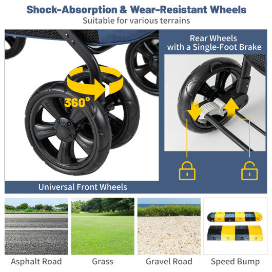 ● Shock-Absorption and Wear-Resistant Wheels: The 4-wheel dog stroller is equipped with 2 universal front wheels and 2 rear wheels with a single-foot brake providing a smooth and safe ride. Moreover the shock-absorption wheels are suitable for various terrains such as asphalt roads grass gravel roads speed bumps etc.