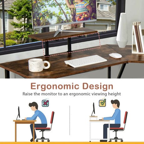 88.5 Inch L Shaped Reversible Computer Desk Table with Monitor Stand-Rustic Brown