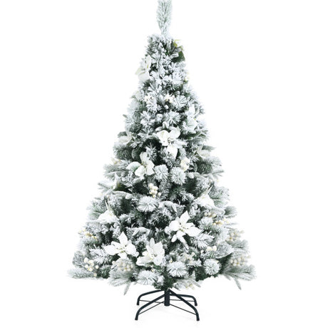 5 Feet Snow Flocked Hinged Christmas Tree with Berries and Poinsettia Flowers