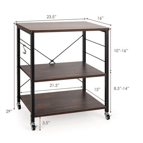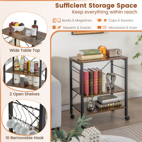 3-Tier Kitchen Baker's Rack Microwave Oven Storage Cart with Hooks-Rustic Brown