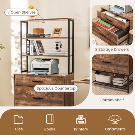Freestanding File Cabinet with Charging Station and 3-Tier Open Shelves-Rustic Brown
