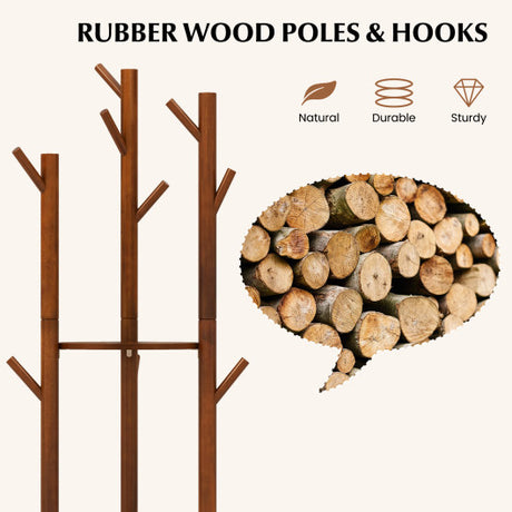 Freestanding Wooden Coat Tree with 3 Display Storage Shelves and 9 Hooks