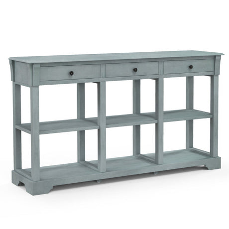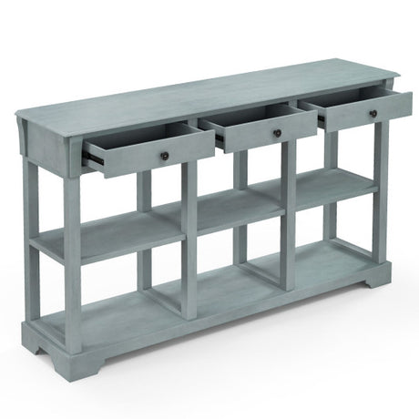 58 Inch Retro Console Table with 3 Drawers and Open Shelves Rectangular Entryway Table-Blue