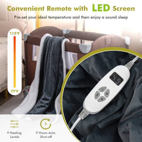 Electric Heated Blanket Throw Reversible Flannel and Sherpa Blanket-Gray