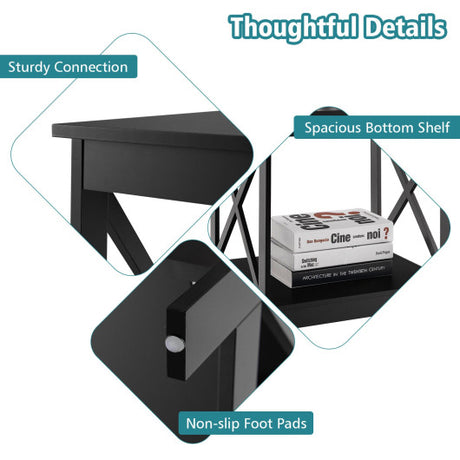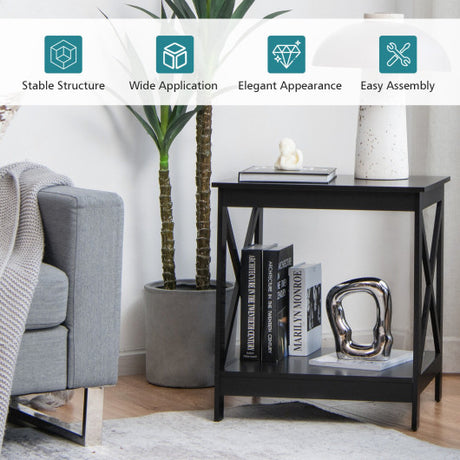 2-Tier Side Table with X-shape Design and 4 Solid Legs-Black