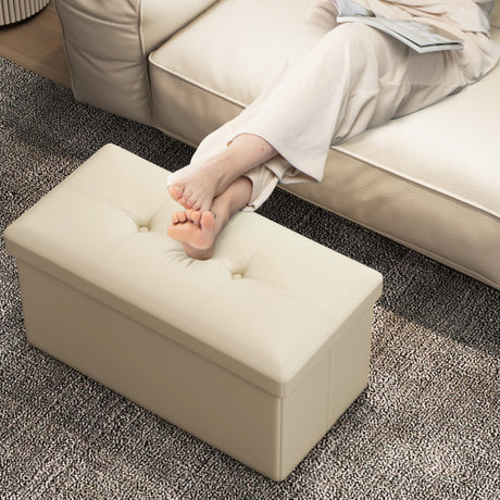 Upholstered Rectangle Footstool with PVC Leather Surface and Storage Function-White