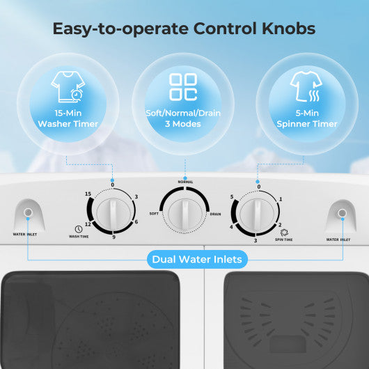 ● Easy-to-Operate Control Knobs: The portable washing machine makes laundry a breeze with 3 rotary controllers for simple operations including a 15-min washer timer 5-min spinner timer and a mode selector. Stay in control of your laundry routine with just a turn of the knob.